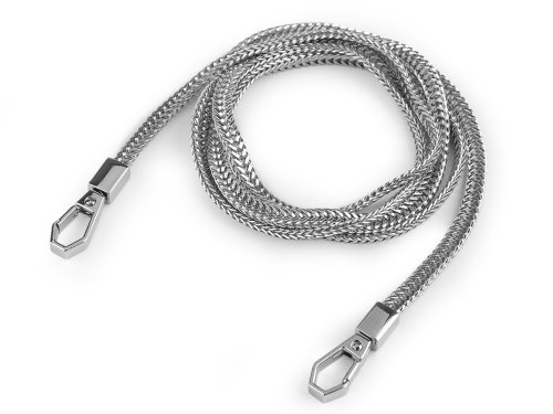 Plochý řetízek vyniká svým kvalitním zpracováním a vysokým leskem. Využijete ho na menší kabelky a psaníčka. Na obou jeho koncích najdete připevněné karabinky, které mají nevšední hranatý design. Řetízek není určený na velkou zátěž.