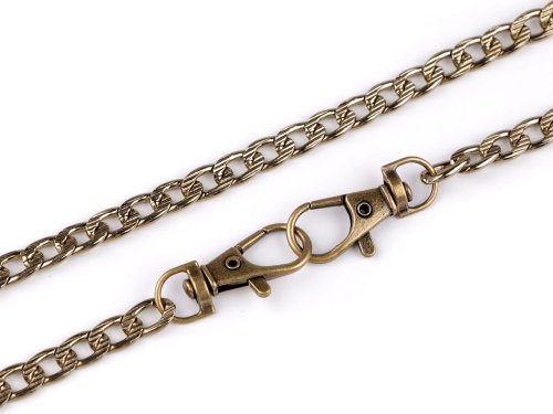 Řetízek [na kabelky] je zajímavým svým povrchem, který zdobí reliéf. Očka jsou oválná. Řetízek má na každé straně karabinku.