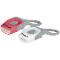 Kompaktní set pogumovaných svítilen na kolo. Tyto přední a zadní svítilny na kolo jsou ideální pomocník v případě, že potřebujete malé, praktické a lehce odnímatelné světlo především na kolo. Obě světla mají 2 LED diody, přední bílé světlo a zadní červené, které skvělé poslouží. Navíc obě jsou s funkcí blikání.