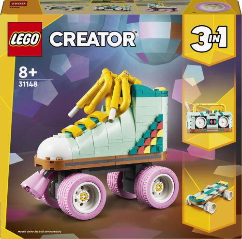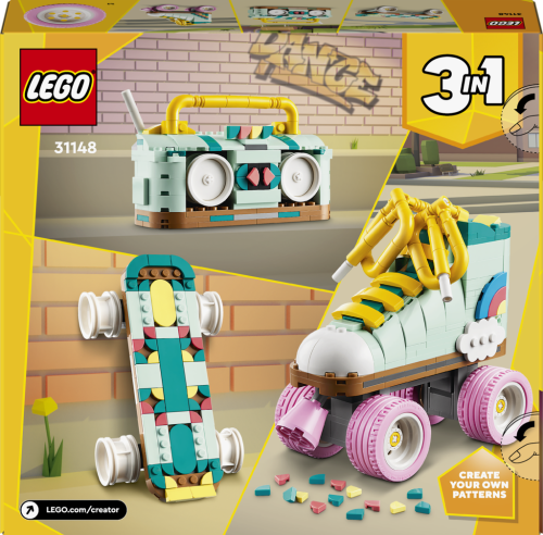 Kreativní děti od 8 let se se stavebnicí LEGO® Creator 3 v 1 (31148) Retro kolečkové brusle vrátí do minulosti. Postaví si s ní kolečkovou brusli LEGO se 4 pohyblivými růžovými kolečky, růžovou brzdou, tlustou žlutou tkaničkou a sadou barevných dílků, se kterými ozdobí patu brusle podle vlastní fantazie.