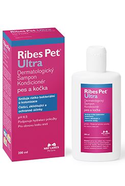 Ribes Pet Ultra dermatologický šampon a kondicionér pro psy a kočky. Snižuje riziko bakteriální kolonizace kůže. S čistícím, zklidňujícím a ochranným účinkem.