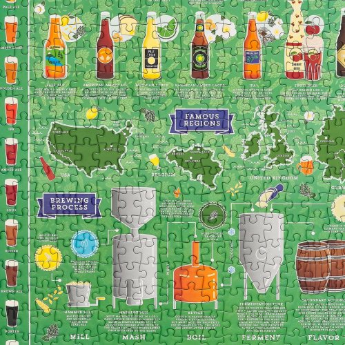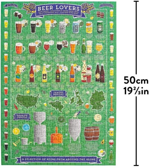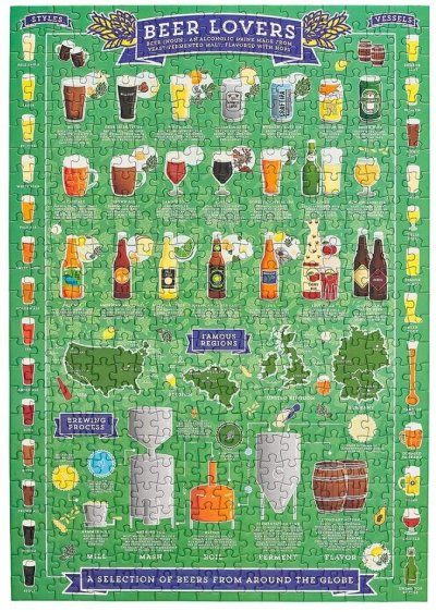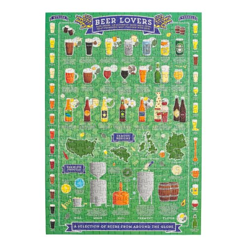 Milovníci piva – otevřete si vychlazené a připijte si na tuto skládačku pro milovníky piva! Při řešení krásného, ručně ilustrovaného rébusu se dozvíte o oblíbených druzích piva, regionech a pomocí průvodce na puzzle. Toto 500dílné puzzle je perfektním dárkem pro každého vášnivého pivaře, obsahuje kolekci piv, ležáků, plzeňských piv a vše je balené v papírové tubě ve stylu plechovky. Hlavní vlastnosti: Obsahuje 500 dílkůPotištěno netoxickými inkoustyPrémiová kvalita puzzleJednotlivé dílky do sebe přesně pasujíRozvíjí logické myšlení a motoriku