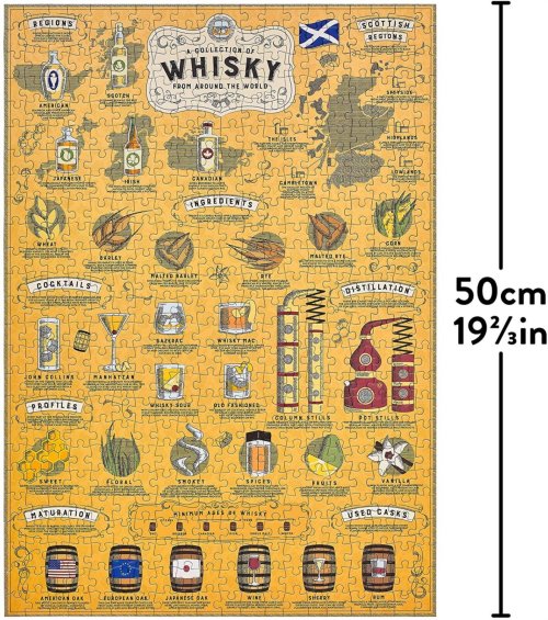 Milovníci whisky zvedají sklenku k této 500dílné skládačce! Připijte si klasickou skotskou gaelskou „vodou života“ dokončením tohoto 500dílného puzzle. Je to perfektní dárek pro každého milovníka whisky, který obsahuje kolekci oblastí whisky, degustační poznámky a koktejly. Baleno v tubusovém obalu ve stylu láhve whisky a je dodáváno s odpovídajícím plakátovým průvodcem. Hlavní vlastnosti: Obsahuje 500 dílkůPotištěno netoxickými inkoustyPrémiová kvalita puzzleJednotlivé dílky do sebe přesně pasujíRozvíjí logické myšlení a motoriku