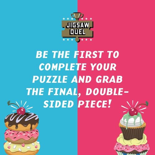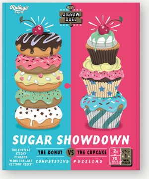 Soutěžní puzzle pro dva - to je puzzle Duel od Ridley's Games. Skládačku však může úspěšně dokončit pouze ten rychlejší z vás. Soutěží se totiž o poslední dílek, který je oboustranný a společný pro obě puzzle. Nejdříve si vyberte svůj oblíbený dezert (cupcakes nebo donuty), odstartujte závod a pusťte se do skládání. Vítězem se stává ten, kdo jako první poskládá své puzzle a vloží do něj poslední dílek. Ideální pro všechny, kteří si chtějí zaskládat i zasoutěžit.. Součástí balení jsou dvě barevné předlohy skládaného motivu a dřevěný stojánek, který drží poslední vytoužený dílek. Rozměr složeného puzzle cca 12 x 26 cm