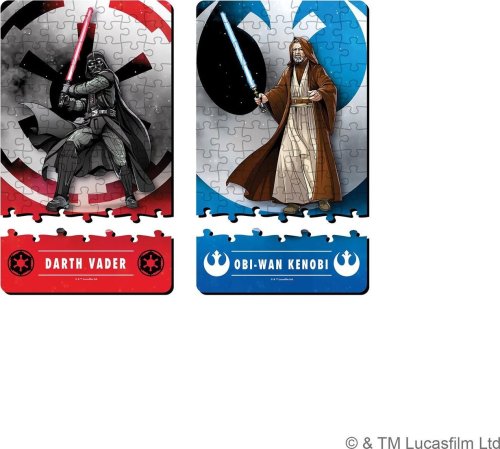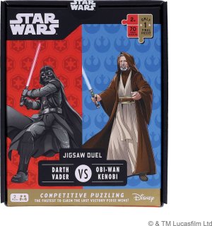 Soutěžní puzzle pro dva - to je puzzle Duel od Ridley's Games. Skládačku však může úspěšně dokončit pouze ten rychlejší z vás. Soutěží se totiž o poslední dílek, který je oboustranný a společný pro obě puzzle. Kdo zvítězí v tomto puzzle souboji Star Wars: Darth Vader nebo Obi-Wan Kenobi? Nejdříve si vyberte svého hrdinu, odstartujte závod a pusťte se do skládání. Vítězem se stává ten, kdo jako první poskládá své puzzle a vloží do něj poslední dílek. Ideální pro všechny, kteří si chtějí zaskládat i zasoutěžit.. Součástí balení jsou dvě barevné předlohy skládaného motivu a dřevěný stojánek, který drží poslední vytoužený dílek. Rozměr složeného puzzle cca 12 x 26 cm