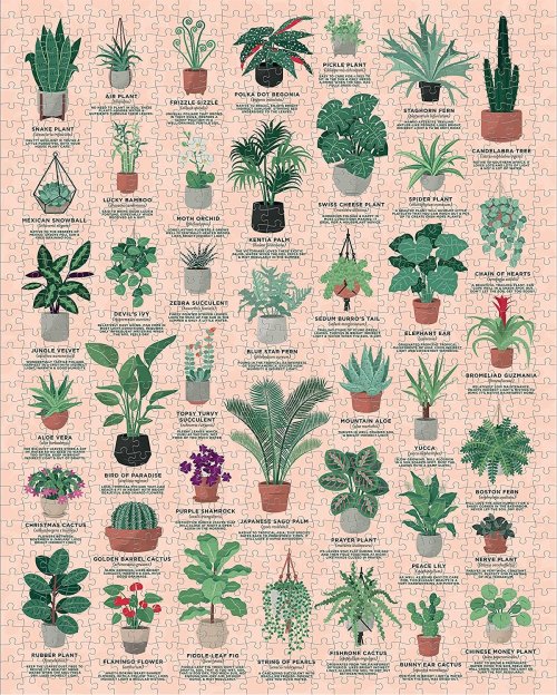 Více než 30 pokojových rostlin a zajímavá fakta a pokyny k péči o ně. Texty na puzzle jsou v angličtině. Součástí balení je předloha skládaného motivu.
