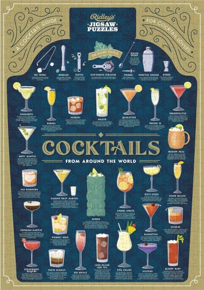 Puzzle z kolekce Ridley de Wild +amp; Wolf stvořené pro milovníky koktejů a budoucí mixologisty. Objevíte více než 25 lahodných nápojů z celého světa a dozvíte se něco o jejich historii. Uvnitř najdete také recepty na osm oblíbených nápojů týmu Ridley. (Texty na puzzle jsou v angličtině.) Rozměr složeného puzzle cca 35 x 50 cm