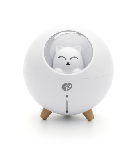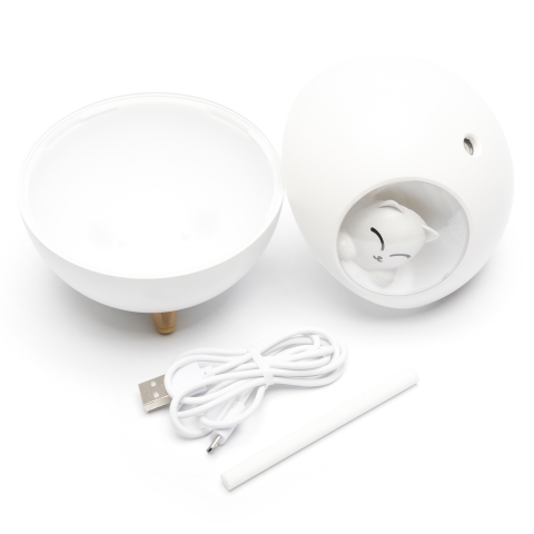 Difuzér esenciálních olejů, zvlhčovač vzduchu a dětské noční světlo napájené z USB Vhodný pro použití v dětském pokoji nebo dětském pokoji S roztomilou, rozkošnou kočkou Lze použít s esenciálními oleji Kapacita 220 ml vody pro 5 hodin nepřetržitého mlžení Automatické vypnutí Provoz z USB Podporuje klidný spánek Dodává vlhkost do suchého vzduchu v místnosti Uklidňující, jemné noční světlo se 7 barvami