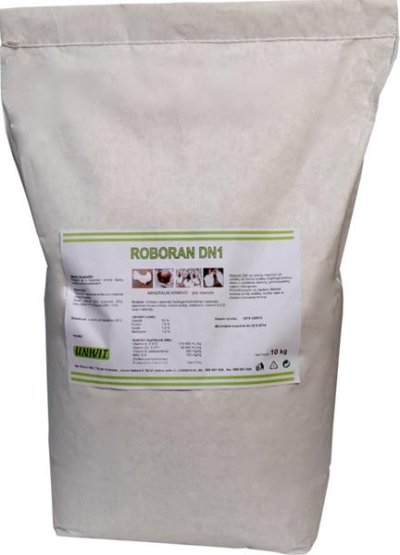 ROBORAN DN1 je vitamíno-minerální přípravek do krmiva určený pro nosnice od začátku do konce snášky. Doplňuje krmnou dávku o potřebné vitamíny, aminokyseliny, makro a mikrominerální látky (Fe, Cu, Zn, Mn, I, Se, Ca, Na, P) v optimálních dávkách. Vápník potřebný pro tvorbu vajec je ze 60 - 70% hrazen přímo z krmiva a ze 30 - 40% je čerpán z kostí. Fosfor je v krmivech rostlinného původu vázán v solích kyseliny fytové, z níž je drůbeží špatně využíván. Dodáním fytázy výrazně stoupá stravitelnost fytinového fosforu a rovněž se zlepšuje i využití vápníku a aminokyselin.