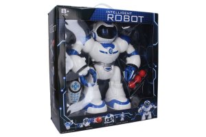 Robot střílející míčky RC na dálkové ovládání. Rozměry 36x17x40 cm. Infračervený port. Vydává světelné a zvukové efekty. Funkce - střílí míčky z levé ruky, drží předměty v pravé ruce, podsvětlený obličej, programování, chůze, tanec, hudba, demo režim, nastavení hlasitosti. Součástí 3 míčky. 5xAA (1.5V) baterie do robota, 2xAA (1.5V) do ovladače nejsou součástí.