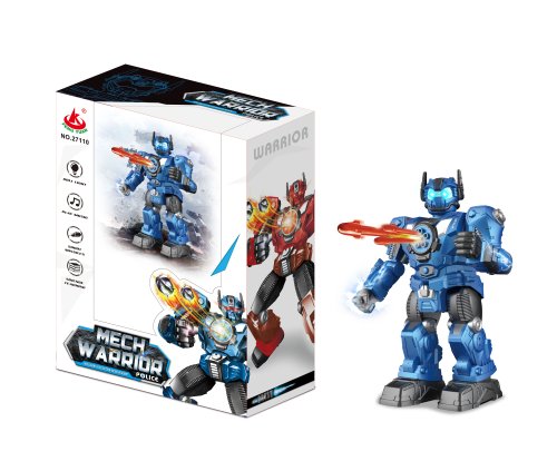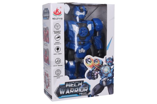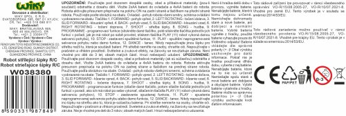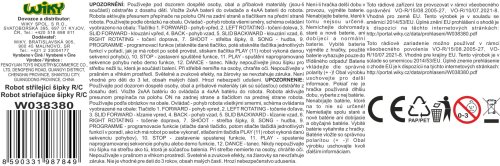 Robot střílející šipky RC na dálkové ovládání. Rozměry 24x10,5x33,5 cm. Infračervený port. Součástí 5 šipek. Světelné a zvukové efekty. Funkce - střílení šipek, programování, demo režim, chůze, klouzání, tanec, hudba. 4xAA baterie do robota, 2xAA do ovladače nejsou součástí. Tlačítko demo v pase robota. Přepínač ON/OFF na zadní straně robota.