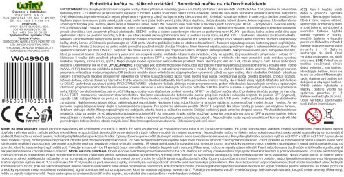 Robotická kočka RC na dálkové ovládání. Rozměry 21x18x13 cm. Infračervený port. Bateriový pack 3.7V 400mAh Li-ion do kočky, 2xAAA do ovladače nejsou součástí. USB kabel součástí. Přepínač ON/OFF v zadní části hlavy. Reaguje na dotyk hlavy. Ovladač - pohyb, demo, programování (až 30 kroků), nastavení hlasitosti.