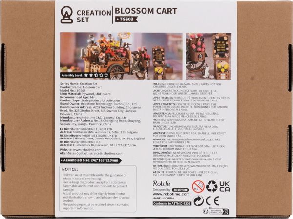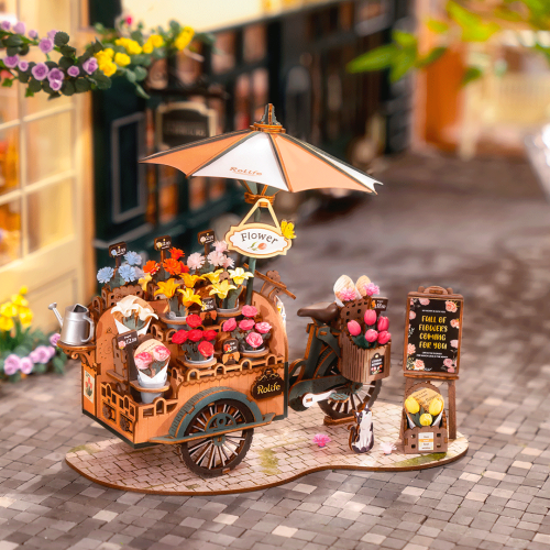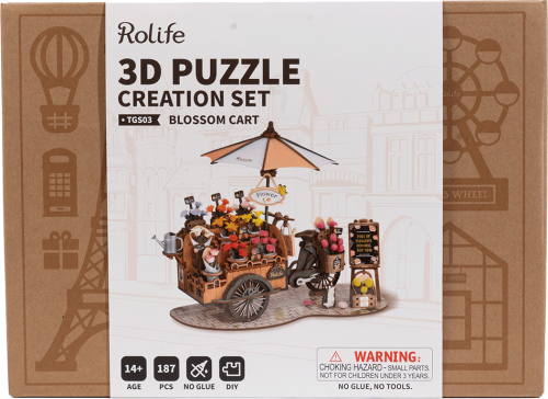 Květiny prozáří každý den! Tato skládačka Vás přenese do minulosti na tržiště, kde vozík s květinami projížděl městem a prodavač nabízel kolemjdoucím vonící čerstvé růže, lilie či tulipány. Tento dřevěný vozík ve vintage stylu připojený k jízdnímu kolu pro prodavače má rustikální otáčecí kola, slunečník chránící květiny před horkem a konev na zalévání. Vedle vozíku je umístěna tabule s nabídkou květin doplněná košíkem zářivě žlutých tulipánů. Roztomilá kočička sleduje, co se kolem děje a vůně květin přilákala i žlutého motýla. Kytice můžete v nádobách měnit a když je vyprodáno, nádoby vyprázdnit. Skládání 3D skládačky podporuje rozvoj jemné motoriky, prostorového myšlení a trpělivosti. Pozvěte svou rodinu nebo přátele a užijte si zábavné tvoření bez nutnosti použití lepidla nebo nástrojů. Všechny díly skládačky jsou přesně vyřezané a očíslované a lehce do sebe zapadnou, aby výsledek byl stabilní a odolný. Skládačka je dodávána v nesloženém stavu, zabalená v krabici s podrobným návodem k sestavení. Hlavní vlastnosti: 187 dílkůdoba skládání 2,5 hodsnadná montáž bez použití lepidla a nástrojůstřední obtížnost sestavenírozvíjí logické a motorické dovednostipodporuje trpělivost dětíideální jako dárek nebo jedinečná dekoracepodrobný návod k sestavení součástí balení