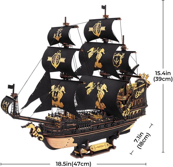 Robotime 3D mechanická skládačka Plachetnice vás přenese do zlatého věku námořních bitev. Elegantní černo-zlatá galeona s funkčním kormidlem a skrytými kanóny okouzlí všechny milovníky modelů lodí i zajímavých dekorací.