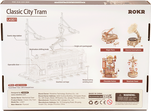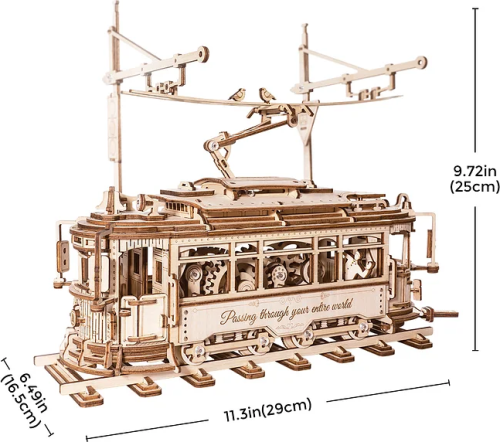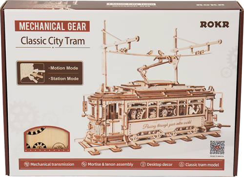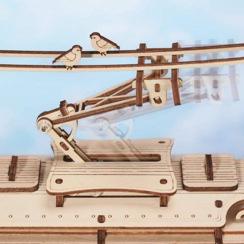 Vysoce přesné převody pro stabilní provoz. Plynulý pohyb díky převodovce a mechanice ozubených kol. Změna názvu stanice po otočení střešního knoflíku. Na rovném povrchu může ujet 3-5 metrů. Působivé detaily - otevíratelné dveře, jednoramenný pantograf, navíjecí páka. Součástí modelu je i nástupiště s trolejovými sloupy, trolejové vedení a koleje. Laserem předřezané dílky z kvalitní lipové překližky pro stavbu svépomocí. Rozvíjí technické myšlení, představivost, cit pro detail a jemnou motoriku. Přehledný obrázkový návod krok za krokem, včetně QR kódů pro zobrazení videonávodu. Překrásný dárek pro větší děti i dospělé, elegantní dekorace.