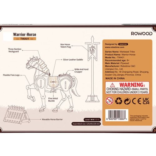 Vojsko je shromážděno a připraveno k boji! Tato dřevěná 3D skládačka koně Vám přinese spoustu zábavy při stavění a hraní. Přední končetiny koně jsou pohyblivé a dají se ohnout. Obličej, hřbet a břicho jsou pokryty stříbrným brněním, které poskytuje koni všestrannou ochranu. Břišní část zbroje je navíc opatřena stylovými kovovými přezkami. Kromě samotného koně je součástí této skládačky také totemová bojová vlajka a mobilní zábrana. Skládačka je dodávána v nesloženém stavu, balena v krabici. Vybaveno detailním návodem k sestavení. Výborně se doplňuje s Bojovým slonem (kód TWA02), Bojovným lvem (TWA03), Vlkem bojovníkem (TWA04). S nimi bude armáda neporazitelná! Případně mohou změřit své síly mezi sebou! Hlavní vlastnosti: skládačka koně, vlajky a zábranykožené stříbrné brněnípohyblivé končetiny