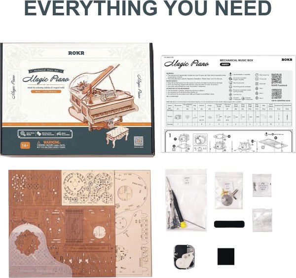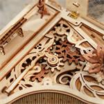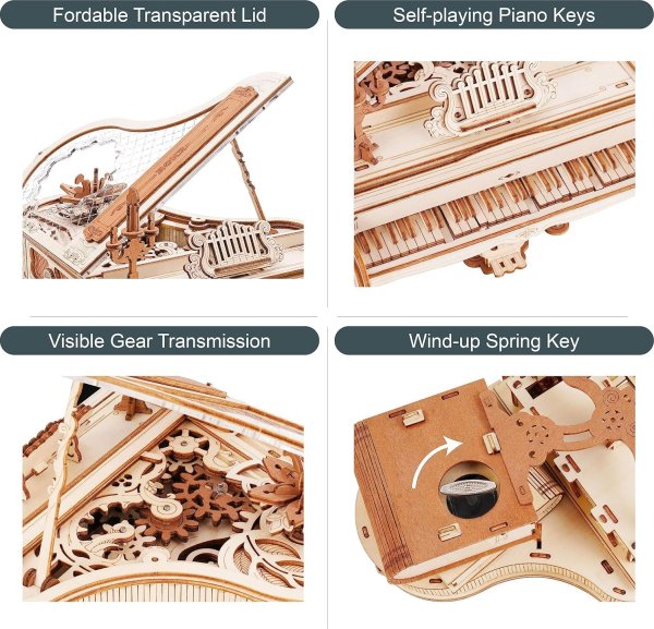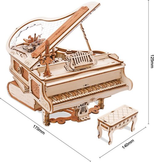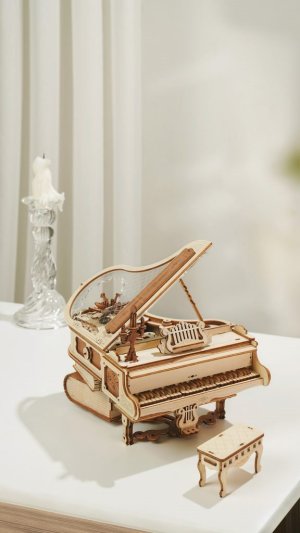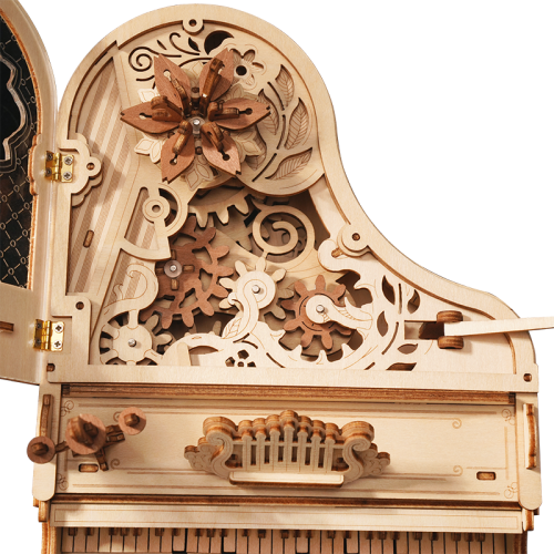 Průhledné víko klavíru je zdobené složitými vzory připomínající křišťál. Kouzelné knihy naskládané pod tělem klavíru nahrazují původní nohy klavíru a hrají roli opory a fixace. Díky důmyslné mechanice se některé klávesy samy pohybují nahoru a dolů. Retro svícen a stojan na noty. Hrací skříňka na klíček s melodií: Kánonové variace. Heterochromatická soustava ozubených kol s hnědými květy, které se pomalu otáčejí se zvukem hracího strojku. Laserem předřezané dílky z kvalitní lipové překližky pro stavbu svépomocí, lepidlo není potřeba. Rozvíjí technické myšlení, představivost, cit pro detail a jemnou motoriku. Přehledný obrázkový návod krok za krokem, včetně QR kódů pro zobrazení videa.