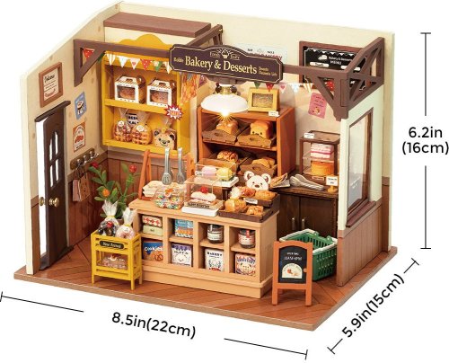 Tento miniaturní domeček ve stylu vintage pekárny je vyzdoben originální barvou dřeva, je velmi útulný a tichý, jako byste přes okno cítili sladkou vůni pšenice smíšenou s jemnou vůní mléka. Na pultech a v regálech je zákazníkům nabízeno spoustu chutných chlebů, dortů a zákusků. Můžete malovat, sestavovat, prošívat, vytvářet architekturu a přetvářet dekorace. Spousta hodin tvoření a zábavy - orientační doba na složení 4 hodin. Kvalitní, bezpečné a netoxické materiály. Osvětlení vytvoří nádhernou noční atmosféru. Překrásný dárek pro větší děti i dospělé. Po dokončení působivá dekorace.