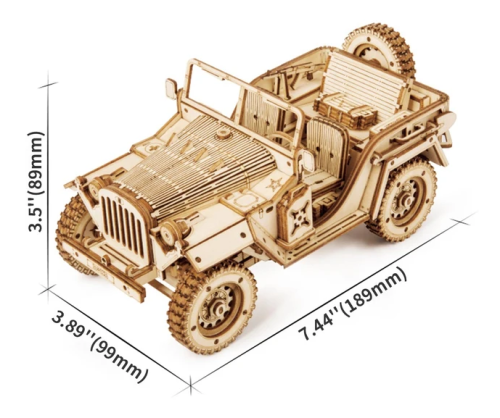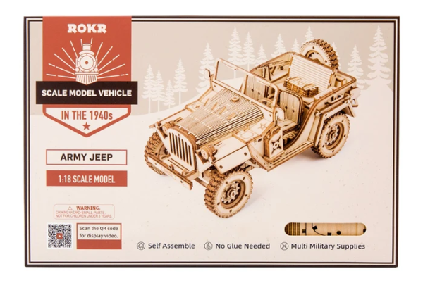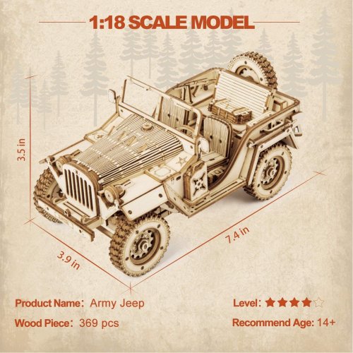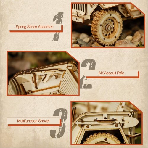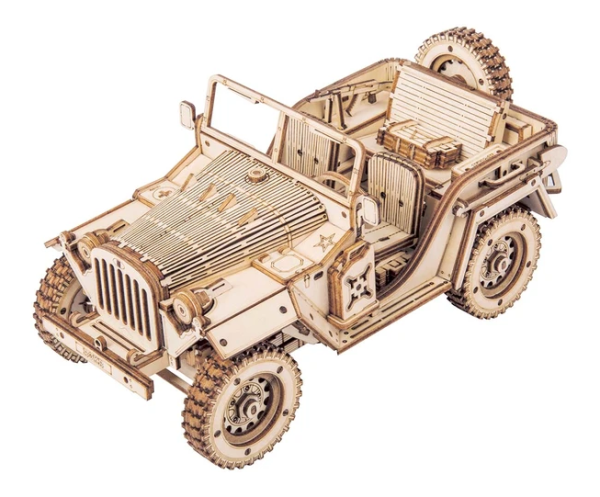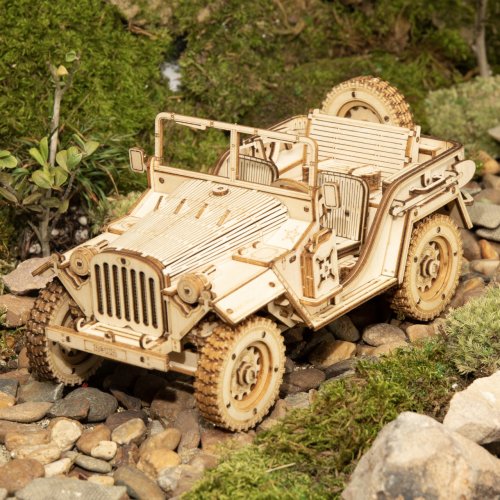 Detailní model vojenského džípu v měřítku 1:18 byl inspirován legendárními džípy GAZ ze 40. let, u nás známými pod přezdívkou „Čapajev“. Je určen k vystavení a dekoraci, není proto pohyblivý. Pro radost všem technickým nadšencům je ovšem vybaven funkčním odpružením náprav. Přírodní úprava je univerzálně vhodná do každého interiéru, model však můžete přizpůsobit a nabarvit podle vlastních představ. Nezapomeňte se nám svou úpravou pochlubit! Skládačka je dodávána v krabici spolu s podrobným ilustrovaným návodem k sestavení. Hlavní vlastnosti:369 precizně vyřezaných dílkůstřední obtížnost sestaveníodpružené nápravy