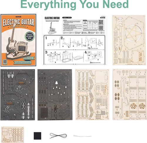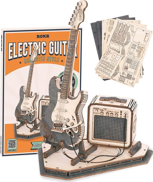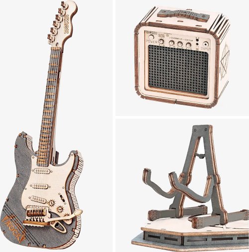 Dřevěný model elektrické kytary včetně zesilovače z řady Robotime ROKR Musical instrument.