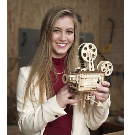 Atraktivní a neobvyklý model bez použití baterií. Vychutnejte si černobílý film z klasického Chaplinova díla. Mechanický pohon ruční klikou. Přesně vyřezané dílky laserem. Jednotlivé dílky se vytlačují přímo z překližky, postupujte posloupně a opatrně. Sestavení bez použití lepidla. Kvalitní, bezpečné a netoxické materiály. Rozvíjí technické myšlení, představivost, cit pro detail a jemnou motoriku. Design ve starožitném stylu a nádherný vzhled z něj dělají uměleckou dekoraci. Skvělý dárek ke všem příležitostem.