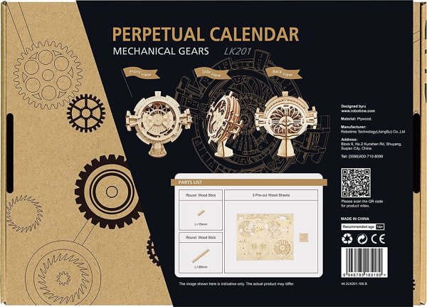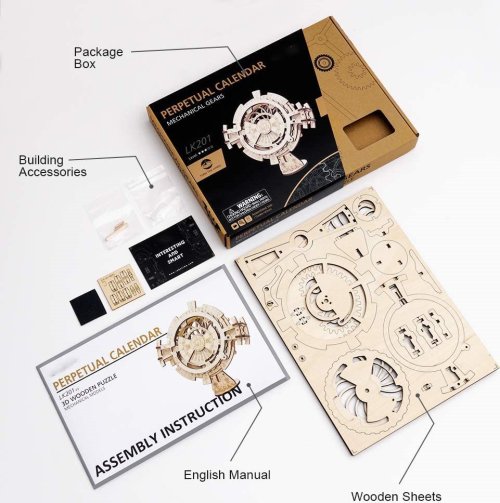 Věčný kalendář dokáže zobrazit kalendárium pro roky 2018 - 2040. Snadné nastavení roku a měsíců díky převodové soustavě. Stabilní a pevný stojan pro vystavení. Díly jsou vyřezány laserem z kvalitní lipové překližky. Rozvíjí technické myšlení, představivost, cit pro detail a jemnou motoriku. Skvělý dárek pro milovníky mechaniky, rodinu a přátele k jakékoliv příležitosti.