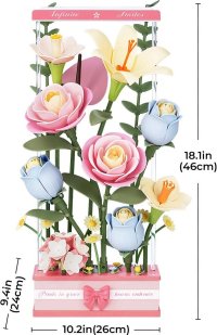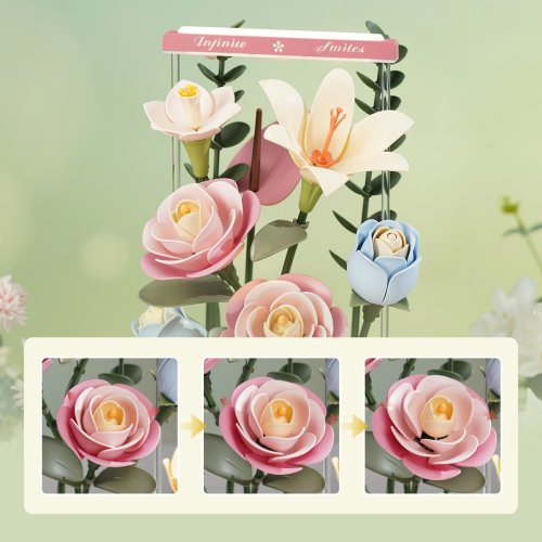 Obsahuje 8 realistických květů, které se jemně otevírají a zavírají díky pomalému motoru, čímž vytvářejí efekt časosběrného záběru. Každý květ si můžete libovolně uspořádat – flexibilní stonky umožňují vlastní aranžmá. Kompozici navíc oživuje šest typů osvětlení, včetně LED a optických vláken. Kvalitní, bezpečné a netoxické materiály. Rozvíjí technické myšlení, představivost, cit pro detail a jemnou motoriku. Obtížnost: 4 z 5 (dle rozdělení Robotime).