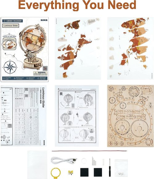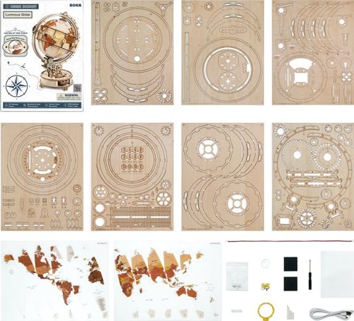 Obtížnost: 4 z 5 (dle rozdělení Robotime). Orientační doba na složení: 4 - 7,5 hodiny. Popisy měst, oceánů a kontinentů na globusu jsou v angličtině. Balení obsahuje: materiál pro výrobu modelu, šroubovák, smirkový papír, voskovou tyčinku, USB kabel, detailní obrázkový návod s QR kódem pro zobrazení instruktážního videa.