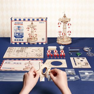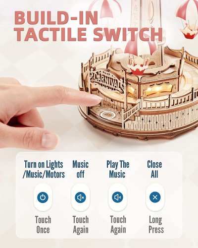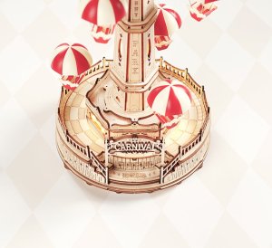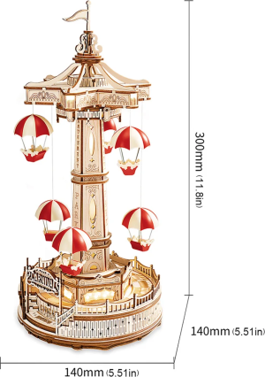 Se světly a hudbou, ovládání dotykovým senzorem (hudbu lze vypnout). Sedačky s padáčky se pohybují nahoru a dolů. Řada působivých detailů. Spousta hodin zábavy při skládání s kouzlem mechanických převodů. Laserem předřezané dílky z kvalitní lipové překližky pro stavbu svépomocí. Rozvíjí technické myšlení, představivost, cit pro detail a jemnou motoriku. Přehledný obrázkový návod krok za krokem, včetně QR kódů pro zobrazení videonávodu. Překrásný dárek pro větší děti i dospělé, elegantní dekorace.
