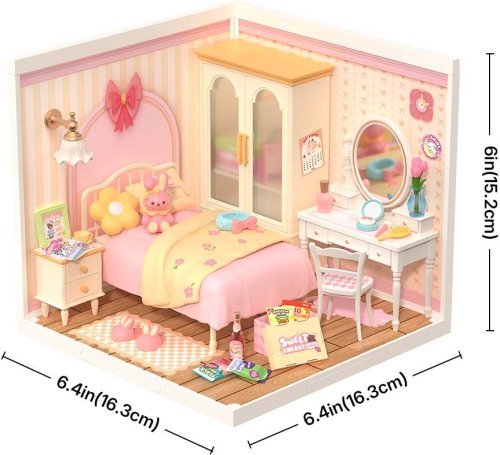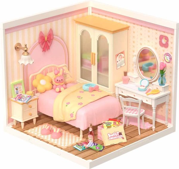 Je pohodlná, stylová a jednoduchá, ale přesto má vše, po čem byste kdy mohli toužit. Vestavěná skříň ukrývá úhledně složené oblečení a doplňky, toaletní stolek se zrcadlem vám umožní se upravit, roztomilý noční stolek drží zarámovanou vzpomínku, čtecí lampička vrhá jantarovou záři a plyšový králíček sedí na květinovém polštářku na posteli Dokonce i podlaha je posetá útulnými detaily, jako je vzorovaný kobereček, pohodlné pantofle nebo čokoládové dobroty a pochutiny. Každý detail dělá z tohoto pokoje skutečně osobní a neodolatelné místo, kde můžete relaxovat, načerpat energii a užít si své tvořivé hobb Obtížnost: 1 z 5 (dle rozdělení Robotime). Orientační doba na složení: 1 hodinu.