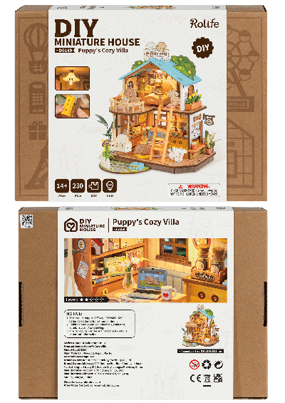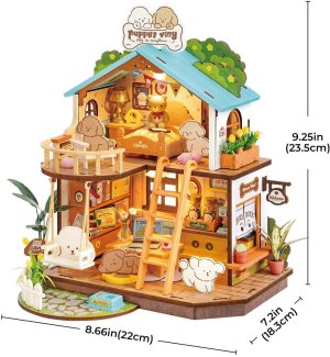 Každý detail je propracovaný do nejmenšího detailu – najdete zde lampičku na nočním stolku, notebook, knihovnu, stroj na puppuccino i zelené rostliny, které dodávají interiéru život a šarm. Postavte si tuto pohodovou vilku inspirovanou láskou a péčí, kterou věnujeme svým mazlíčkům, a užijte si radost z tvoření i snění o štěstí, vrtících se ocáskách a věrném přátelství. Obtížnost: 2 z 5 (dle rozdělení Robotime). Orientační doba na složení: 4 hodiny.