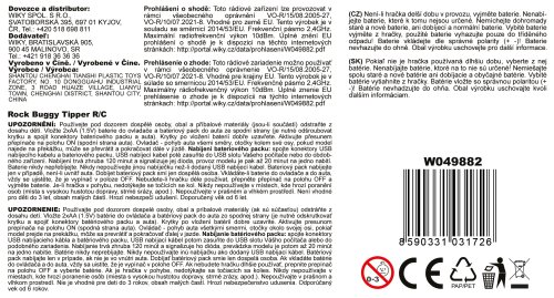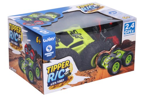 Rock Buggy Tipper RC na dálkové ovládání. Rozměry 15x14x6 cm. Jen zelená barva. Frekvence 2.4GHz. Světelné efekty. Bateriový pack 3.7V 500mAh do auta součástí, 2xAA do ovladače nejsou součástí. USB kabel součástí. Přepínač ON/OFF na spodní straně auta. Provoz 20 min, nabíjení 2 h.