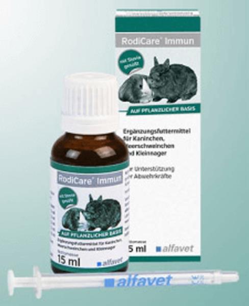 RodiCare® Immun obashuje přírodní látku mumijo, která je bohatá na četné minerální látky. Vyvážený podíl rostlinných látek doplňuje stravu o sekundární rostlinné složky, které mají pozitivní vliv na přirozené obranné reakce organismu. Kromě toho obsahuje zklidňující přírodní aromatické látky (extrakty z eleuterokoku a břečťanu). Složení: Třapatka, macerovaná 3 %, [Sadec konopáč, túje, pelargonie kapská] macerované po 1 %, Mumijo 1 %, [Třapatka, sadec konopáč, túje, pelargonie kapská] mleté po 0,1 % Pelargonie kapská podporuje organismus při nestabilitě obranných sil. Mumijo vyrovnává nedostatky v příjmu stopových prvků. Sadec konopáč, třapatka (echinacea) a túje podporují imunitu. Podávání a dávkování: 2x denně s krmením nebo přímo do tlamičky Podle tělesné hmotnosti: Křeček, osmák degu 0,05 – 0,1 ml Krysa, činčila 0,1 – 0,2 ml Morče 0,2 – 0,3 ml Zakrslý králík 0,3 – 0,6 ml Králík 0,6 – 0,8 ml Doporučená doba podávání: maximálně 8 týdnů Balení: 15 ml skleněná lahvička s dávkovací pipetou