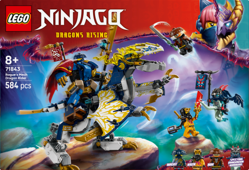 Děti od 8 let si s dobrodružnou stavebnicí Rogue a robotický dračí jezdec připomenou bitvy z 3. řady televizního seriálu NINJAGO® Dračí povstání Děti si můžou s modely hrát samostatně nebo připevnit pohyblivého robota na záda vůbec prvního robotického draka NINJAGO® a vytvořit tak Roguea a robotického dračího jezdce Robotický model má pohyblivé ruce a nohy, otevírací hruď pro umístění minifigurky dovnitř a meč, drak má pohyblivá křídla, hlavu, čelist, nohy a ocas, a k tomu navíc meč Rogue, Arin a dvojice padouchů Rox a Přízračný dračí bojovník, kteří mají prapor s tajnou zprávou, kterou lze přečíst pouze pomocí Arinovy odhalující čepele
