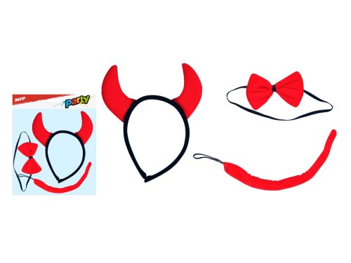 Dětská karnevalová maska - set 3 ks - ďáblík. S touto maskou bude Vaše dítě na karnevalovém plese jen zářit. Čelenka je pevná a dobře drží na hlavě. Součástí ocásku a motýlku je i natahovací gumička, která pevně drží. SET OBSAHUJE: