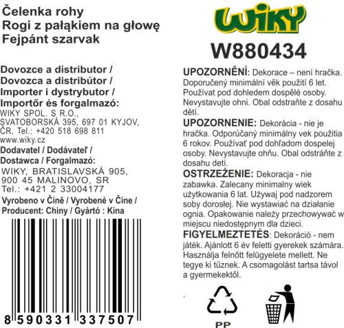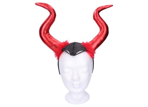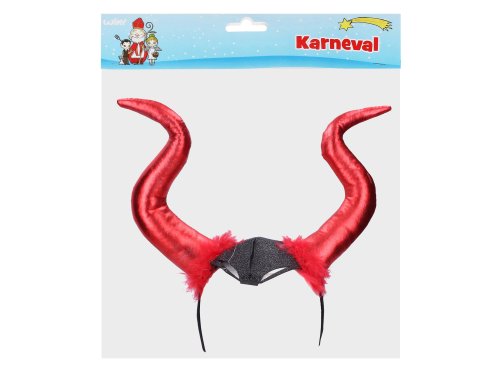 Čertovské rohy v červené barvě oživí každý kostým čerta a čertice. Vycpané rohy jsou z lesklého textilního materiálu, dole ozdobené péřovou aplikací. Připevněno na čelenku do vlasů. Rozměry balení 34 x 30 x 4 cm. Není hračka.