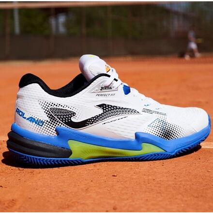 Pánské tenisové boty JOMA Roland Men 2402 jsou navržené pro pravidelné a výkonnostní hráče a jsou vhodné na antukový povrch. Svršek je vyrobený z lehkého a prodyšného nylonu s perforací VTS, aby boty poskytovaly co nejlepší odvětrávání. Pro dosažení potřebného přizpůsobení se noze je na strategických místech tepelně utěsněný syntetický materiál JOMA SPORTECH. Tomu dopomáhá i zpevněný střih s polstrovaným jazykem a šněrováním PERFECT FIT. Ve špičce se nachází vstřikovaná guma technologie PROTECTION k jejímu zpevnění a větší ochraně při nárazu. Mezipodešev je vyrobena z lehkého, pružného phylonu s technologií STABILIS pro maximální odpružení, stabilitu a pohodlí při hře. Podešev DURABILITY je vyrobená z odolné pryže, která poskytuje vysokou úroveň odolnosti vyžadovanou na kurtech i s tvrdým povrchem.