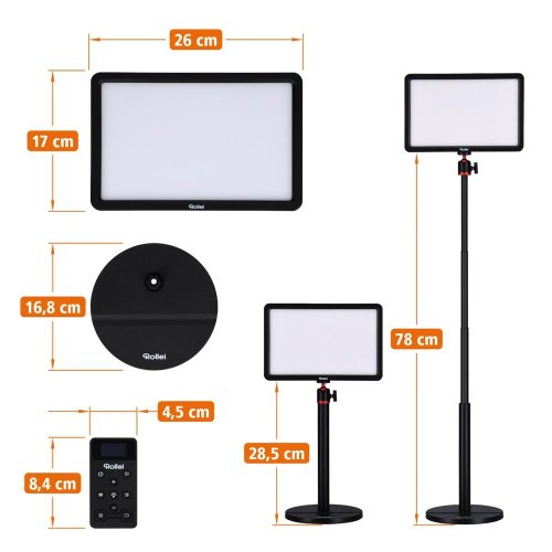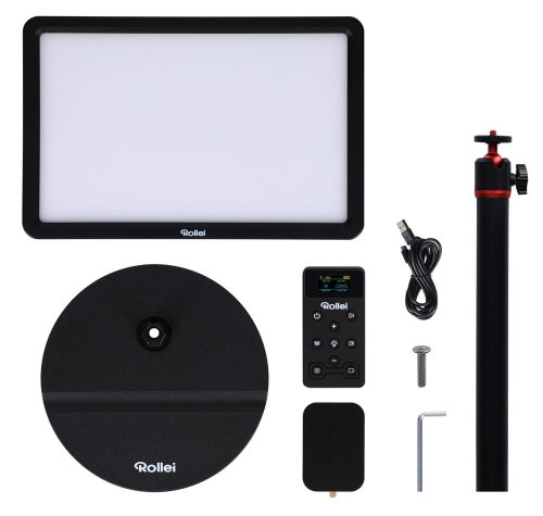 Jejich intenzitu můžete nastavit přímo na panelu, nebo pomocí dálkového ovladače. Rozmezí barevné teploty se pohybuje od 2500 K do 9000 K. Na dálkovém ovladači lze nastavit celkem 7 kanálů. Díky tomu můžete synchronně ovládat několik světel Rollei Lumis Key Light Pro a upravovat nastavení.