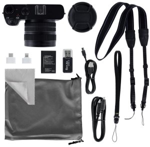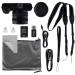 Součástí balení je fotoaparát Powerflex X8 Dual Lens, baterie, USB-C kabel, HDMI kabel, adaptér USB na USB-C, adaptér USB na micro USB, adaptér USB na microSD, poutko na ruku, popruh na nošení, čisticí hadřík, úložný sáček a uživatelská příručka.