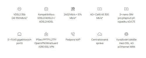 Díky kombinaci DSL, 4G+ Cat6 a Ethernet WAN portů dokáže router vyvažovat zátěž mezi více připojeními pro maximální spolehlivost. Podpora VDSL2/ADSL a LTE failover se dvěma nano SIM sloty zajišťuje nepřetržitý provoz i při výpadku hlavní linky.