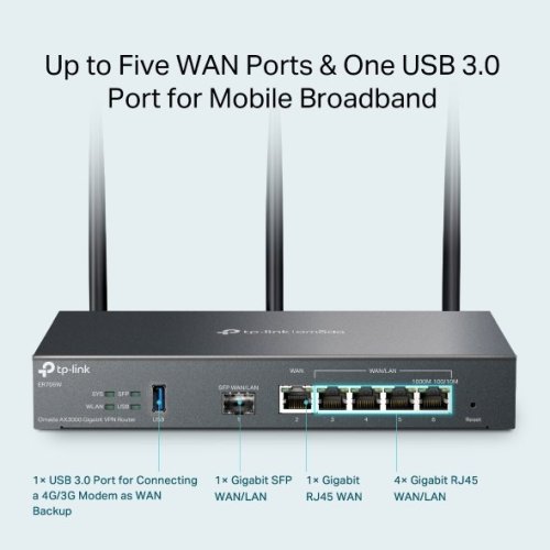 Router je vybaven 1 gigabitovým SFP a 5 gigabitovými RJ45 porty, které splňují různé požadavky na připojení k internetu. Funkce Multi-WAN Load Balancing rozdělí datové toky podle podílu šířky pásma každého portu WAN, aby se zvýšila míra využití širokopásmového připojení. Port USB 3.0 poskytuje vyšší přenosovou rychlost pro mobilní připojení.