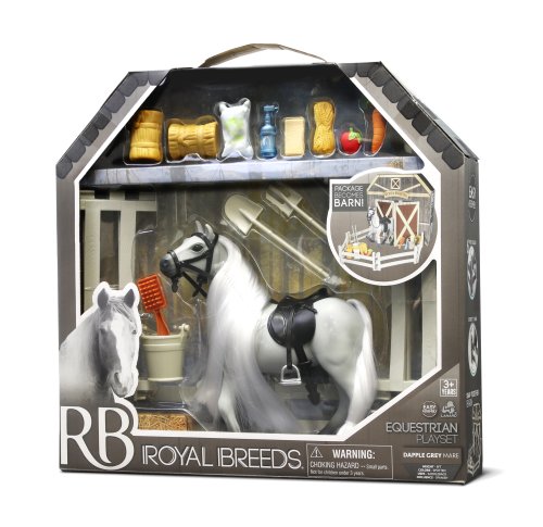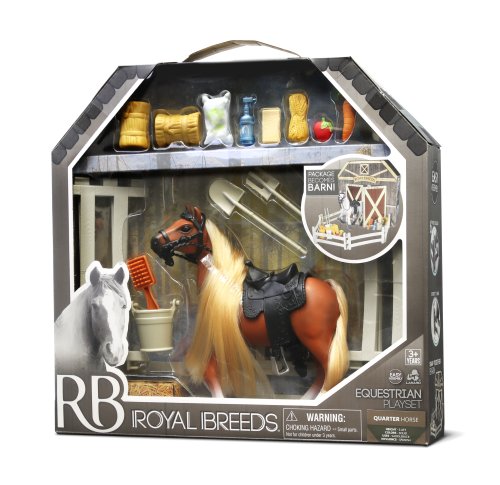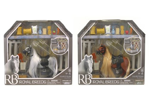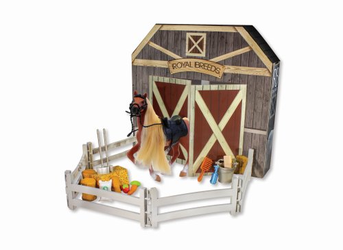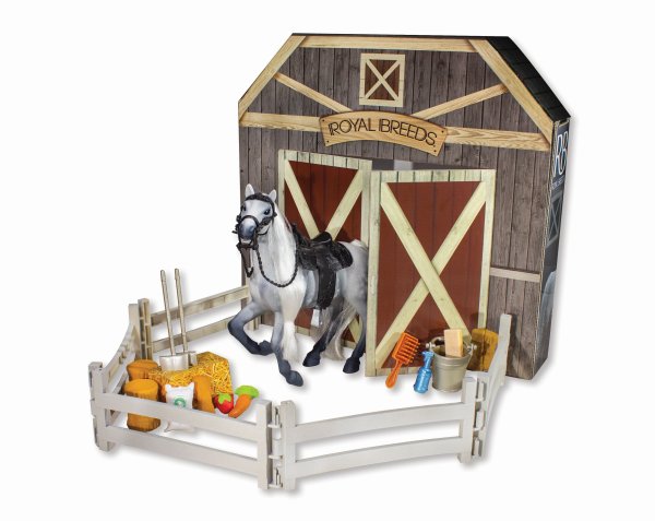 Royal Breeds Koník s ohradou. Velikost 17 cm. Obsahuje také různé příslušenství. Zadní strana obalu se otevírá jako vrata do stájí. 2 varianty - hnědý, šedý.