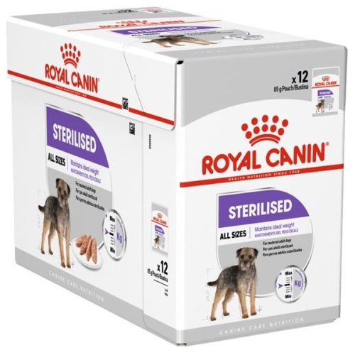 Kapsičky Royal Canin Sterilised jsou určené pro kastrované dospělé psy všech plemen a velikostí od 10 měsíců věku a jsou vhodné také pro psy se sklonem k nadváze. Kompletní krmivo ve formě chutné paštiky pomáhá zamezit nárůstu hmotnosti psa. Balení obsahuje 12 kapsiček. Složení: maso a živočišné produkty, obiloviny, vedlejší produkty rostlinného původu, minerální látky. Analytické složky: protein 8,5 %, obsah tuku 4,1 %, hrubý popel 1,6 %, hrubá vláknina 1,2 %, vlhkost 81,1 %. Nutriční doplňkové látky na 1 kg: vitamín D3 170 m.j., železo 3 mg, jód 0,26 mg, měď 2,1 mg, mangan 0,8 mg, zinek 8 mg. Metabolizovatelná energie: 779 kcal/kg Dávkování: