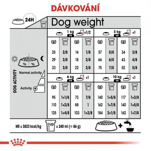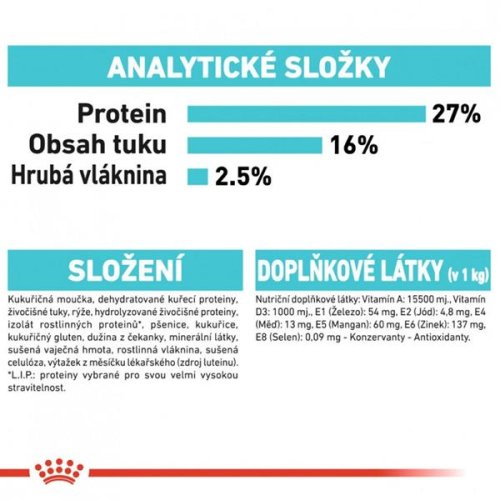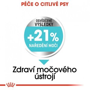 Krmivo ROYAL CANIN® Urinary Care Mini je vhodné pro psy s hmotností do 10 kg, kteří jsou náchylní k citlivému močovému ústrojí. Močové cesty jsou pro psy častým zdrojem problémů. Pokud váš pes nepije dostatek vody, může být jeho moč příliš koncentrovaná. Minerály v moči pak mohou vytvářet krystaly, a nakonec vést ke vzniku bolestivých kamenů. Přizpůsobení výživy vašeho psa může pomoci močové cesty chránit a snížit riziko tvorby kamenů. Krmivo ROYAL CANIN® Urinary Care Mini je vhodné pro psy s hmotností do 10 kg, kteří jsou náchylní k citlivému močovému ústrojí. Tyto granule pro psy s ledvinovými problémy jsou speciálně vyvinuty tak, aby váš pes vypil více vody. Voda navíc má dvojí efekt. Zaprvé proplachuje močový měchýř psa. Zadruhé ředí moč, a tím vytváří méně příznivé prostředí pro tvorbu krystalů a kamenů. Veškerá krmiva ROYAL CANIN® jsou nutričně kompletní a obsahují 100 % kvalitních bílkovin, tuků, vlákniny, vitamínů a minerálů, které váš pes potřebuje pro celoživotní tělesnou a duševní pohodu. Program výživy Urinary Care je dostupný jako křupavé granule a chutné paštiky v kapsičce. Obě jsou nutričně kompletní a dokonale se doplňují. Proč nevyzkoušet paštiku jako doplněk granulí? Výsledky krmiva ROYAL CANIN® Urinary Care Mini jsou prokázaným úspěchem. Vědecké testování v chovných stanicích ROYAL CANIN® ukázalo, že moč byla řidší o 21 %. Složení: Kukuřičná moučka, dehydratované kuřecí proteiny, živočišné tuky, rýže, hydrolyzované živočišné proteiny, izolát rostlinných proteinů*, pšenice, kukuřice, kukuřičný gluten, dužina z čekanky, minerální látky, sušená vaječná hmota, rostlinná vláknina, sušená celulóza, výtažek z měsíčku lékařského (zdroj luteinu). *L.I.P.: proteiny vybrané pro svou velmi vysokou stravitelnost. Nutriční doplňkové látky: Vitamín A: 15500 mj., Vitamín D3: 1000 mj., E1 (Železo): 54 mg, E2 (Jód): 4,8 mg, E4 (Měď): 13 mg, E5 (Mangan): 60 mg, E6 (Zinek): 137 mg, E8 (Selen): 0,09 mg - Konzervanty - Antioxidanty. Analytické složky: Protein 27 %, obsah tuku 16 %, hrubá vláknina 2,5 %.