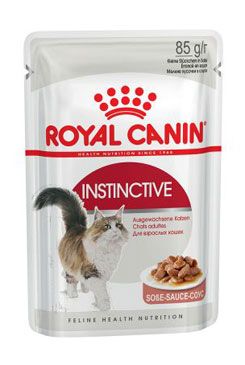 Kapsička Royal Canin Instinctive je vhodná pro vybíravé kočky starší 1 roku. Sebelepší krmivo je k ničemu, pokud ho kočka nejí. Dospělé kočky upřednostňují specifický makronutriční profil. Kombinace vitamínů, minerálů a aminokyselin činí toto krmivo vysoce stravitelné a nutričně vyvážené. Krmivo pomáhá kočce udržet si ideální hmotnost, podporuje zdraví močového systému a obsahuje optimální podíl tuku pro zajištění energetického přísunu. Směs vlákniny a bílkovin navíc přispívá k pocitu sytosti. Složení: maso a živočišné produkty, ryby a výrobky z ryb, bílkovinné extrakty rostlinného původu, obiloviny, minerální látky, vedlejší produkty rostlinného původu, kvasnice. Analytické složky: protein 11,8 %, hrubá vláknina 0,8 %, obsah tuku 2,5 %, hrubý popel 1,6 %, vlhkost 79,5 %. Nutriční doplňkové látky na 1 kg: vitamín D3 30 MJ, železo (3b103) 3 mg, jód (3b202) 0,29 mg, měď (3b405, 3b406) 2,4 mg, mangan (3b502, 3b503, 3b504) 0,9 mg, zinek (3b603, 3b605, 3b606) 9 mg. Krmný návod: