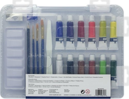 Výtvarná sada v praktickém přenosném obalu pro malé i velké výtvarníky, kteří rádi malují. Sada obsahuje: 3x štetce - 3 velikosti, 1x ořezávátko, 1x grafitovací tužka, 1x plastová špachtle, 1x bílá guma, 1x bílá plastová paletka - 6 misek, 12 ks akrylových barev (žlutá, okrová, sv. červená, červená, tm. modrá, sv. modrá, tm. zelená, sv. zelená, sv. hnědá, tm. hnědá, černá, bílá). Americká kvalita a 60 letá tradice značky Royal +amp; Langnickel přicházejí přímo k Vám domů. Tento světově uznávaný výrobce uměleckých produktů je lídrem na trhu v prodeji výtvarných potřeb. Výrobky jsou pečlivě koncipovány a navrženy tak, aby splňovaly nejvyšší požadované standardy.