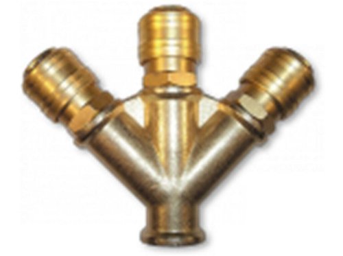 Roztrojka s vnitřním závitem a dři rychlospojky pro zahradní hadice.
