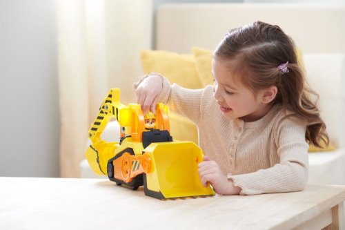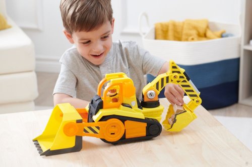 Vytvořte jeden tým spolu se svým oblíbeným pejskem z Tlapkové patroly Rubblem a jeho Buldozerem Bark Yard Deluxe! Tato tlapkózní stavebnice obsahuje opravdová funkční kola, dva kloubové nástroje a působivé světelné a zvukové efekty, které z ní dělají nutnost pro všechny fanoušky seriálu Rubble a jeho parta! Tato úžasná figurka a sada vozidel obsahuje figurku Rubbla, která měří 5 cm na výšku a je oblečená v oficiální uniformě Rubbla a jeho party, takže vypadá přesně jako v seriálu. Když přijde čas dát se do práce, posaďte Wheelera na sedadlo řidiče a zatlačte, čímž spustíte působivé světelné efekty a zvuky ze seriálu! Použijte kloubový bagr a začněte kopat a poté odsuňte hlínu z cesty pomocí pohyblivé lžíce, stejně jako to dělá Rubble! Ještě více zábavy ze světa Rubbla a jeho party vám zajistí stavební náklaďák, figurky, sady s kinetickým pískem Build-it nebo sada s jeřábem spolu se sadou Rubblova dílna, které vám umožní vybudovat vlastní staveniště přímo u vás doma (prodávají se zvlášť)! Přiveďte seriál Rubble a jeho parta k životu pomocí Rubblova buldozeru Bark Yard Deluxe!