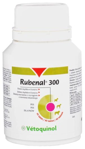 Dietní doplňkové krmivo k podpoře funkce ledvin při chronické nedostatečnosti u psa. Podávání přípravku Rubenal® minimalizuje vazivovatění glomerulů, brání ztrátám proteinů močí a snižuje hladinu kreatininu v krvi. Bylo prokázáno, že extrakt z reveně zlepšuje klinický průběh a zpomaluje progresi CKD u lidí i u zvířat, zlepšuje funkce ledvin a prodlužuje délku života. Složení: výtažek z oddenků a kořenů léčivé byliny reveně lékařské a látky jako anthrachinonové glykosidy (rhein, emodin a aloe-emodin), taniny, deriváty stilbenů, těkavé oleje, mastné kyseliny Analytické složky: hrubá vláknina 31 %, hrubé tuky a oleje 16 %, hrubý popel 10,5 %, hrubý protein 5,7 %, vlhkost 3,7 %, sodík 2,2 %, fosfor 1,8 %, draslík 0,25 %, vápník 0,01 % Rubenal® se snadno se podává, protože tablety s obsahem Rheum officinale jsou chutné pro naprostou většinu psů i koček. Psům jej podávejte jako pilulku, i bez přidání do krmiva. Kočkám tabletu rozmělněte do jídla. Při podávání dbejte na přístup k čerstvé vodě. Dávkování: Rubenal 75 mg: