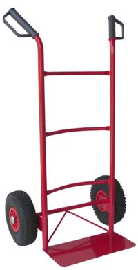 Dvoukolový ruční vozík, ideální pro manipulaci se zbožím v krabicích nebo bednách.